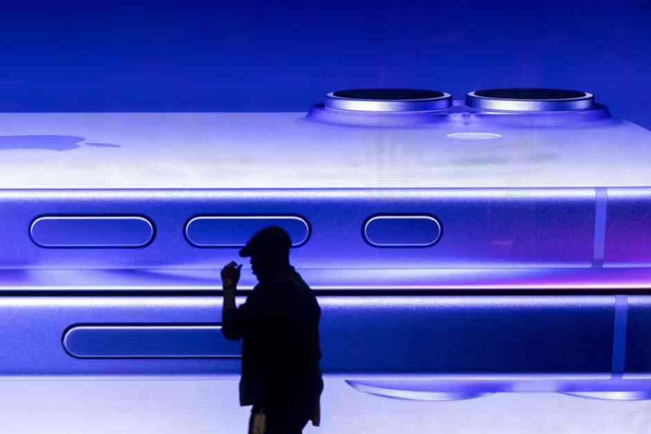 مشي رجل بجانب إعلان لهاتف iPhone في متجر آبل في لندن الوسطى، في 27 يناير 2025.