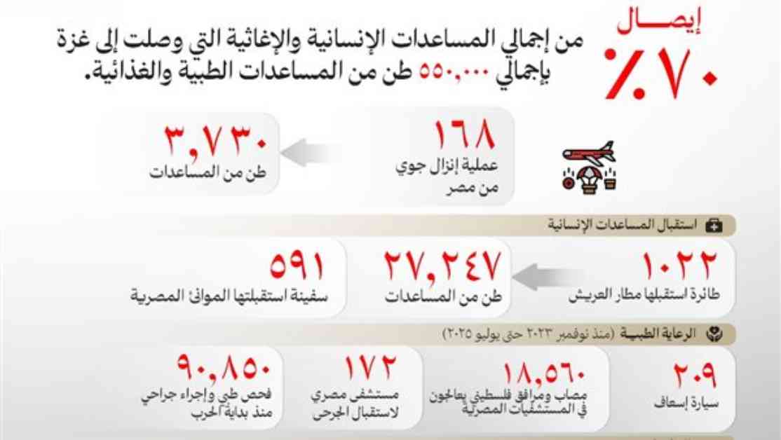 منشور وزارة الخارجية المصري بيان بالمجهودات الإنسانية في غزة، فيه أرقام حول المساعدات والإغاثة، والتي تم توفيرها، والجهود في استقبال المساعدات من الدول، وتوفير الرعاية الطبية للجرحى الفلسطينيين.
