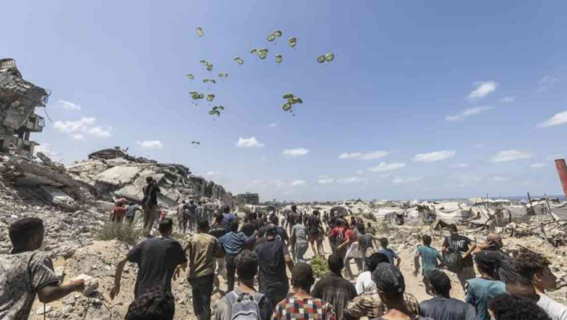 تجمّع فلسطينيين للحصول على مساعدات تلقيها الطائرات وسط الهجمات الإسرائيلية (Getty)